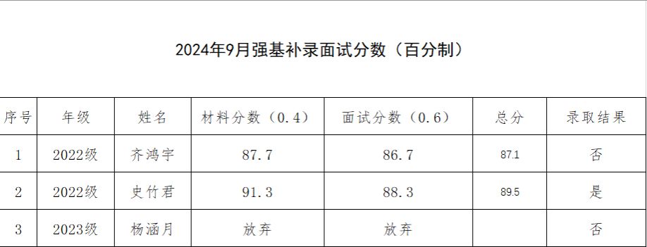 依据《历史文化学院强基计划本科阶段动态调整实施办法 修改版第3版》中有关补录的相关规定,我院于9月13日完成了补录材料审核及面试工作。经学生自愿报名,工作小组审核材料,面试小组对申请学生进行面试,最终面试成绩及录取结果如下: