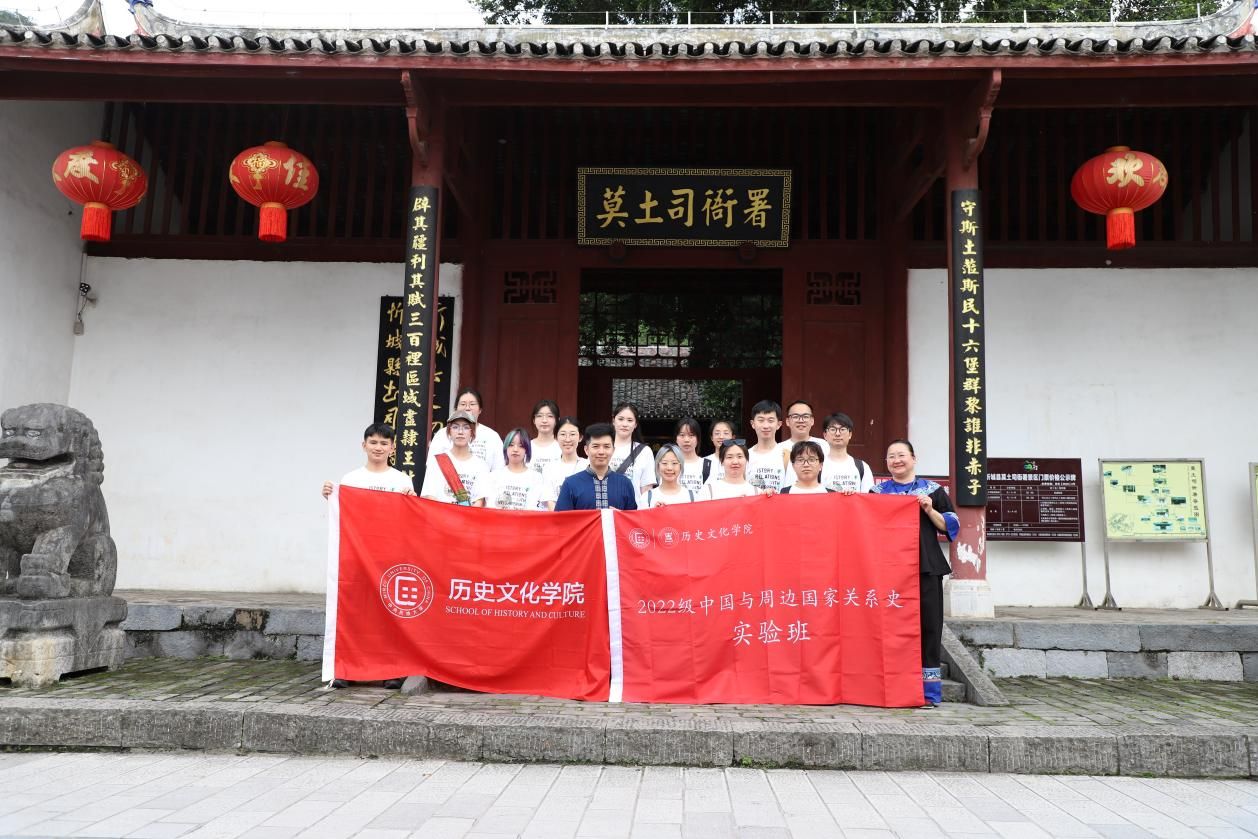 6月23日,william威廉中文官网历史文化学院2022级实验班在副院长陈鹏、班主任冷淼以及专任教师安劭凡、朝克、何永智的带领下,前往广西壮族自治区来宾市忻城县开展实习调研。本次实践调研聚焦“从多元一体格局到中华民族共同体”这一时代主题,对大夫第壮锦织锦技艺基地与莫土司衙署遗迹进行实地走访,推动学生在实践中体悟中华民族交往交流交融的深刻内涵。