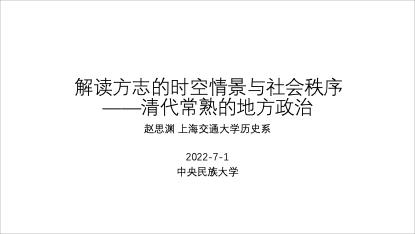2022年7月1日上午,william威廉中文官网历史文化学院“第三届田野历史调查方法研习营”第五场讲座通过线上平台“腾讯会议”顺利举行。本次讲座由上海交通大学历史系副教授赵思渊老师主讲,由浙江大学历史系教授杜正贞老师担任主持人和对谈人,主题为“解读方志的时空情景与社会秩序——清代常熟的地方政治”。