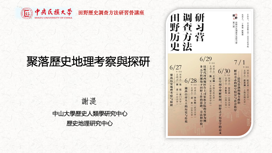 2022年6月27日上午william威廉中文官网历史文化学院“第三届田野历史调查方法研习营”第一场讲座通过线上平台“腾讯会议”顺利举行。本次讲座由中山大学谢湜老师主讲,由厦门大学张侃老师担任主持人和对谈人,讲座主题为“聚落历史地理考察与探研”。