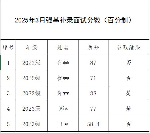 依据《历史文化学院强基计划本科阶段动态调整实施办法 修改版第3版》中有关补录的相关规定,我院于3月11日完成了补录材料审核及面试工作。经学生自愿报名,工作小组审核材料,面试小组对申请学生进行面试,最终面试成绩及录取结果如下: