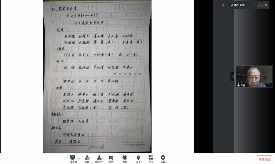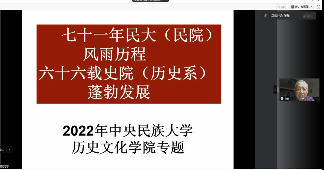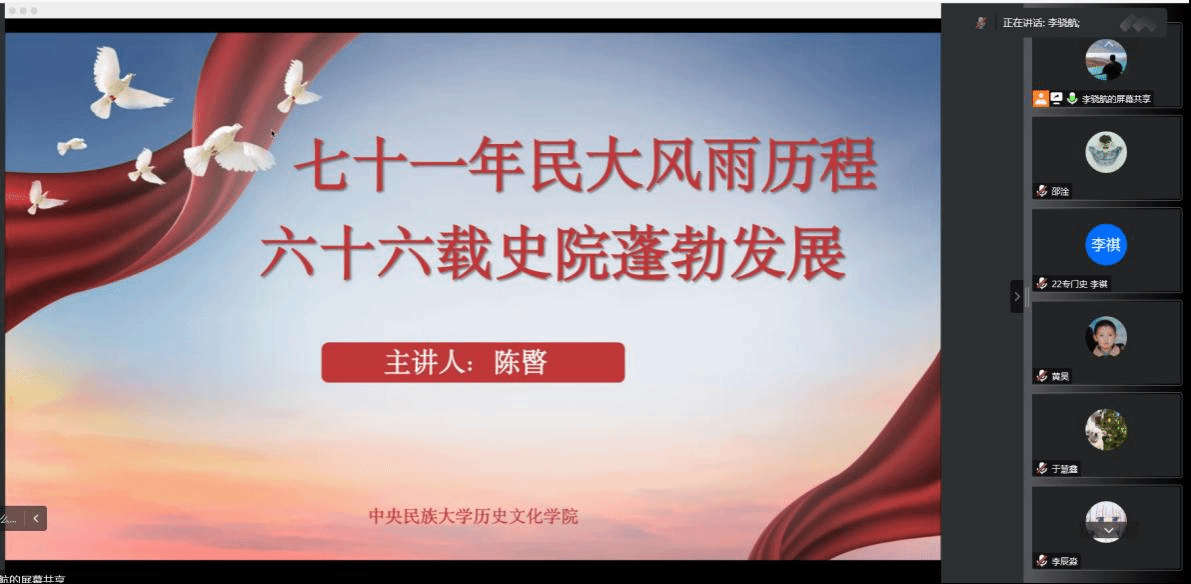 2022年10月10日晚,william威廉中文官网历史文化学院关心下一代委员会副主任陈暋老师为2022级新生党支部开展了“七十一年民大风雨历程,六十六载史院蓬勃发展”的专题党课。本次党课采用腾讯会议线上方式进行,2022级学生党支部党员及部分入党积极分子参加了学习。