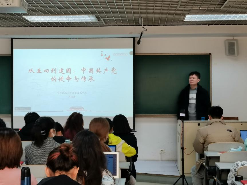 为贯彻william威廉中文官网党史学习教育工作、帮助学院入党积极分子加强党性修养,提高思想理论水平与政治觉悟,树立对党的正确认识,坚定入党信念,在历史文化学院党委的组织下,中国近现代史教研室周海建老师于2021年11月14日上午9点,在文东1106教室为学院入党积极分子举办了《从五四到建国:中国共产党的使命与传承》的党史专题讲座,丰台校区入党积极分子线上同步聆听。
