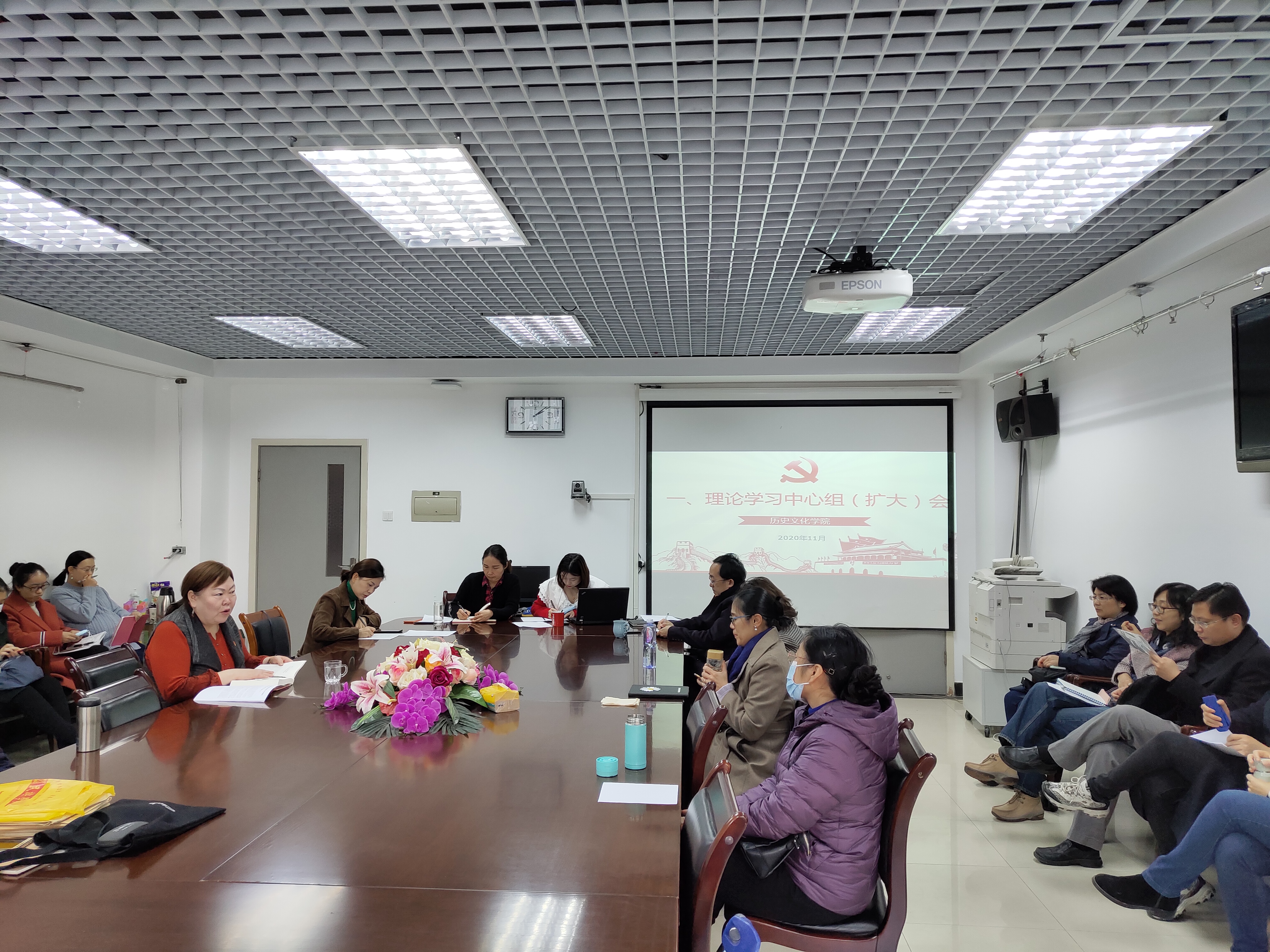 2020年11月13日下午14:00时,历史文化学院党委于文华楼西区1327会议室召开理论学习中心组(扩大)会,会议由刘翠兰书记主持,全体教师参加。会议主要学习内容为党的十九届五中全会精神,重点学习《中共中央关于制定国民经济和社会发展第十四个五年规划和二〇三五年远景目标的建议》。
