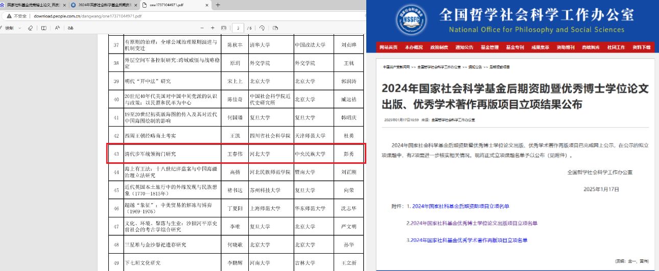 日前,国家哲学社会科研工作办公室公布了2024年度国家社科基金优秀博士学位论文出版项目立项,我院彭勇教授指导的2023届中国史(明清史方向)博士毕业生王春伟喜获立项。