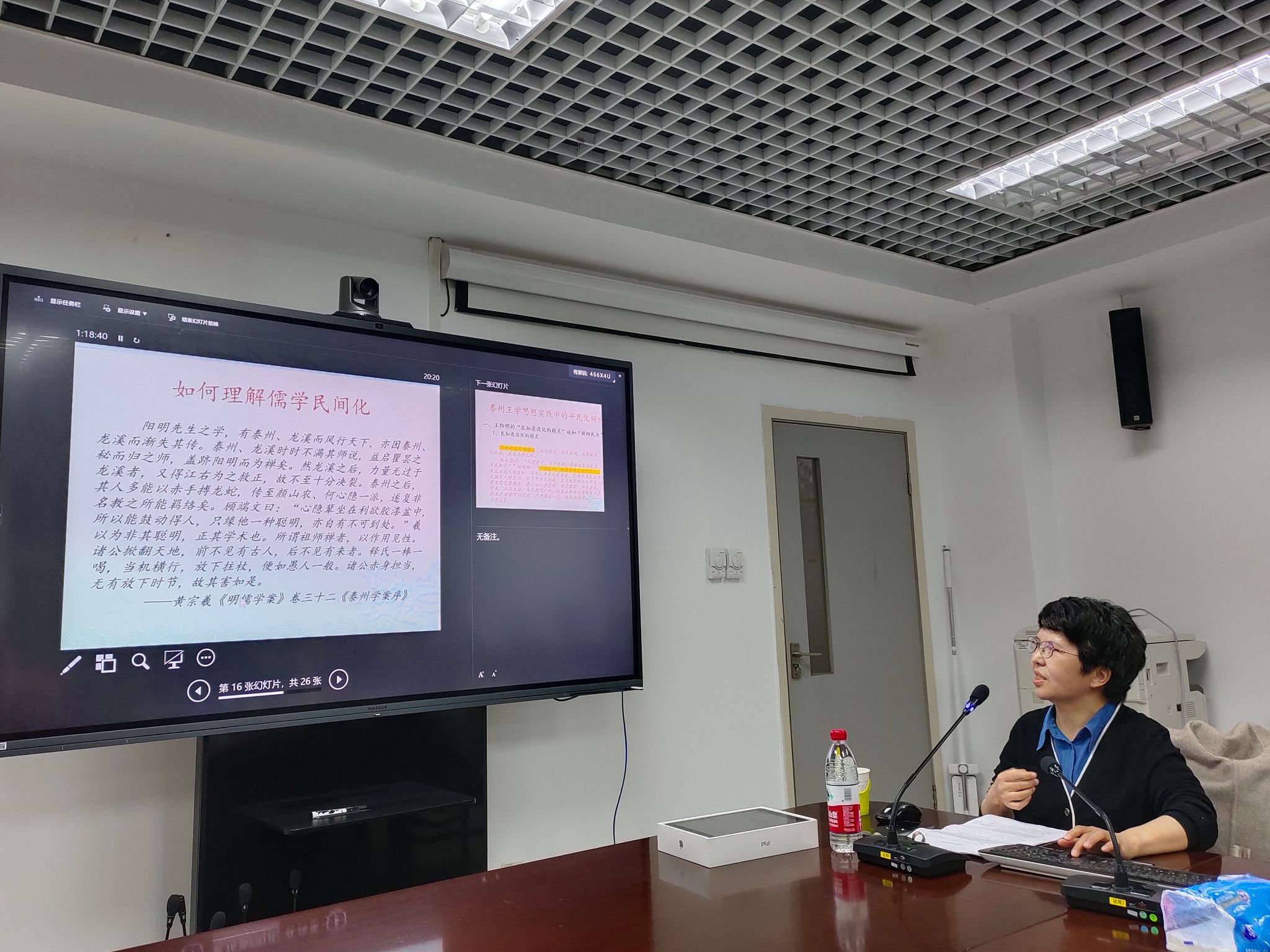 马晓英老师随后讲解了新儒学的发展历程与主要流派,剖析了程朱理学、明代朱子学、陆王心学和泰州学派等派系的主题、理论范畴以及经典依据,并进一步揭示新儒学的发展历程。马老师尤为关注宋明儒学的民间化议题,指出明代儒学发展出新的特征,其一是平民化,这一时期儒学反映出平民阶层的精神和诉求;其二是生活化,如泰州学派提出“百姓日用之学”,重视日常的生活实践;其三是简易化,儒生将儒学理论和修养方法简化,有助于儒学的传播。民间化的儒学有别于传统的精英士大夫儒学,以地方化、“异端”、非主流的形式呈现,不再重续道统,转而解构朱子学的道统,并提出直接传承孔孟的主张。