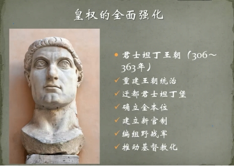 屋大维创立了奥古斯都体制,夏老师指出这一体制最大的好处在于既维持了共和国的空壳子,又能使领袖较为稳定地掌握罗马最高权力。夏老师从历史长时段的视野,将罗马国家政治体制演变线索继续向下延展。屋大维创立的元首制经历了朱利亚—克劳狄王朝、弗拉维王朝、涅尔瓦一安敦尼王朝、塞维鲁王朝。至三世纪罗马国家出现了危机,戴克里先明确推行君主制,并实行“四帝共治”。戴克里先之后,内战再次爆发。最终胜利者君士坦丁开启了新的王朝统治,又推行一系列全面强化专制权力的举措,如迁都君士坦丁堡、确立金本位、建立新官制、编组野战军、推动基督教化等,更重要的明确皇位父死子继,解决了戴克里先之后的帝位继承问题。对于罗马帝国经历的兴衰治乱,夏老师运用双周期理论来解释,即第一个周期经历动乱、内战,伟大领袖稳定下来,走向和平。当第二个周期重新启动时,同样经历内战、领袖统治,最后和平,但后一个周期领袖的权力会比前一个周期更大,否则很难将处于动乱中的罗马国家稳定下来。