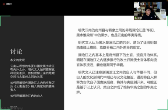 最后一部分是讨论。罗老师列举了一些前辈学者对相关问题的讨论,并对文章进行总结。明代云南的府州县与羁縻土司的界线澜沧江是“华阳、黑水惟梁州”中的黑水,也是云南的华夷界线。明代文人认为黑水是澜沧江的共识,是为了证明明朝西南疆土格局、族群分布、江内外差异的现实。华夷有别包含了三层含义。一是黑水之内的华夏与爨系夷人有别,二是澜沧江之内的华夏与澜沧江之外的夷有别,三是明朝通过不同的统治制度将他们都纳入了疆域体系。在明代,“无间华夷”是明朝疆域内的华夷关系,虽然华夷有别,但均属于明朝疆域。