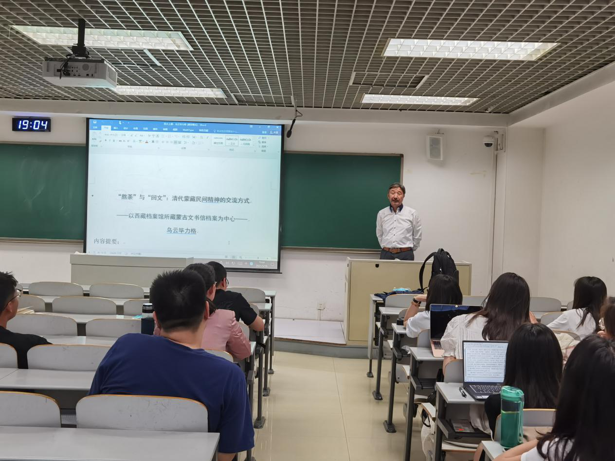 2021年5月18日晚19:00,中国人民大学国学院教授乌云毕力格老师应邀在文东1106教室进行了题为《“熬茶”与“回文”:谈蒙藏民间精神文化交流的方式——以西藏档案馆藏蒙古文书信档案为中心》的讲座。本次讲座由历史文化学院赵令志教授主持,我校五十余名师生到场聆听学习。