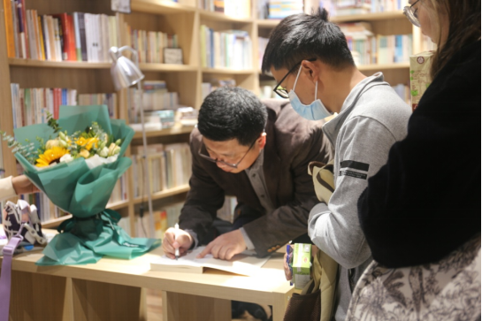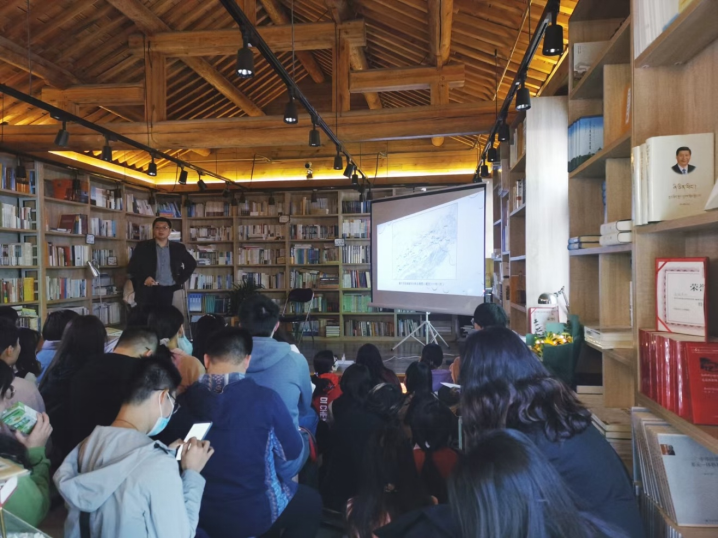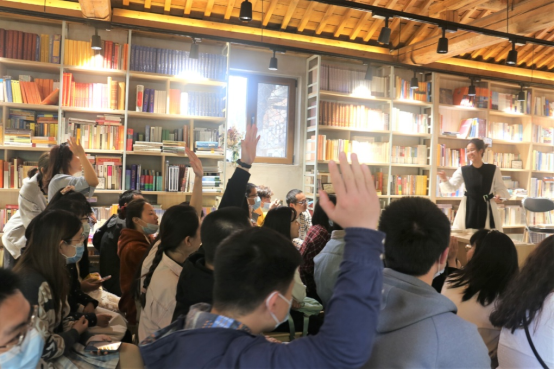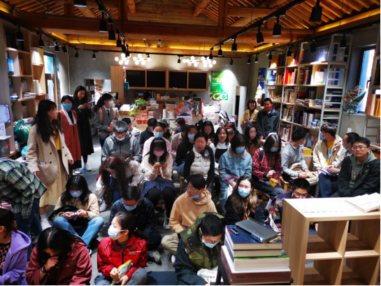 活动在团结书社举办,得到民大出版社曹红玉老师的鼎立支持。历史文化学院的廖靖靖老师主持读书会并参与对谈,到场的同学们来自学校各个学院,大部分已经在线上环节完成了对应论著的阅读,在书店独特的人文氛围之中,师生读书论史的热情持续高涨,因场地有限,部分同学们“见缝插针”席地而坐,坚持参与整场读书活动,原计划的1个半小时,在师生丰富的互动过程里延长到2个半小时,大家仍然意犹未尽、不愿离去,沉醉在历史地理的广阔天地,万类霜天竞自由,不知时间之流逝。
